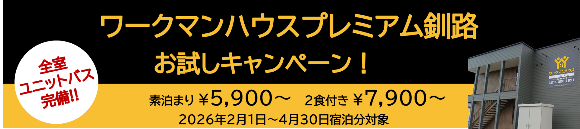 【期間延長】部屋数限定!ワークマンハウスプレミアム釧路 お試しキャンペーン