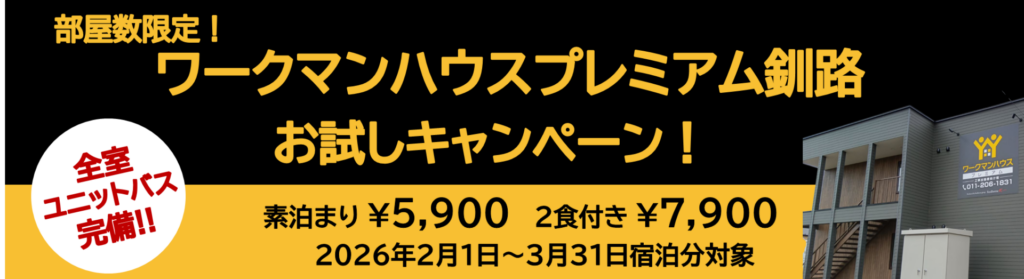 コストを抑えつつワンランク上の滞在を叶えるこの機会に是非、ワークマンハウスプレミアム釧路をご利用ください!
