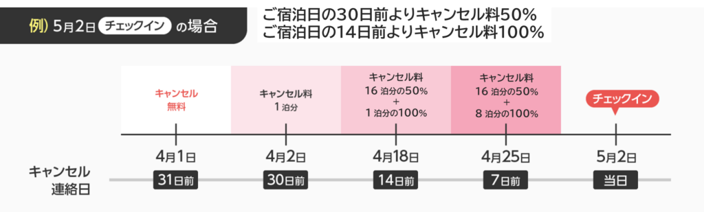 | キャンセル料 | チェックイン日の31日前まで無料 チェックイン日の30日前から100% |